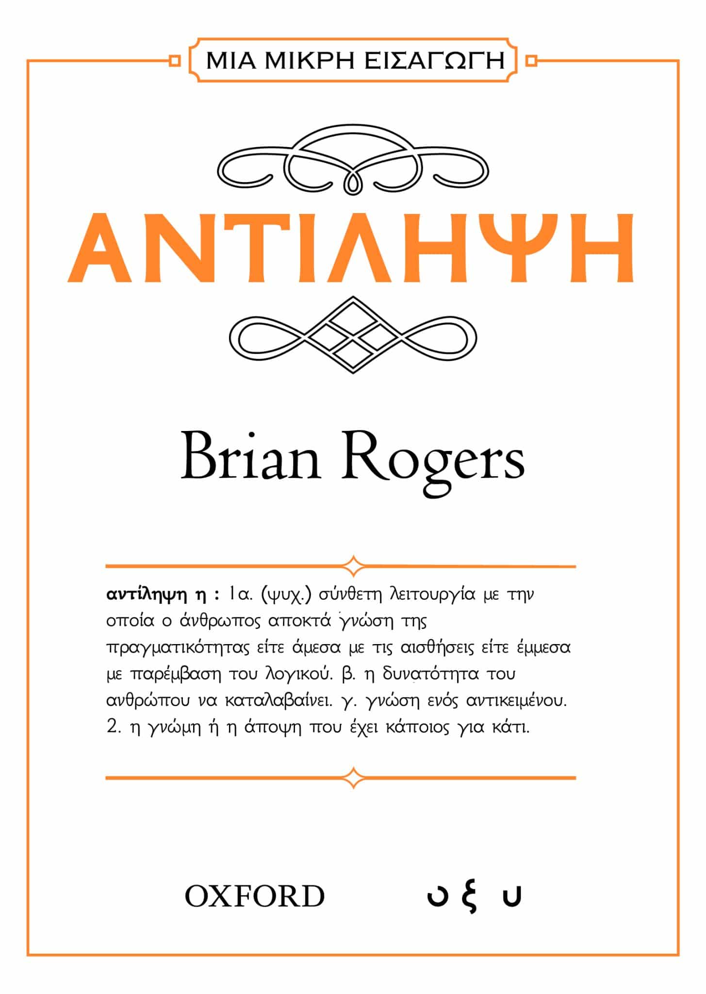 Στο βιβλίο «ΜΙΑ ΜΙΚΡΗ ΕΙΣΑΓΩΓΗ: Αντίληψη», ο Brian Rogers εξετάζει τη φιλοσοφική και ψυχοφυσιολογική πτυχή της αντίληψης. Περιγράφει πώς η αντίληψη διαμορφώνει τις υποκειμενικές εμπειρίες μας και πώς χρησιμοποιούμε τις αισθήσεις ως μέσο καθοδήγησης της συμπεριφοράς μας. Επικεντρώνοντας την προσοχή του στον μαγικό κόσμο των οπτικών αποκλίσεων/παραπλανήσεων, ο Brian J. Rogers αναδεικνύει την πορεία της αντίληψης μέσα από το πρίσμα της φυσικής εξέλιξης. Η ανάλυση του Rogers αποκαλύπτει την πολυπλοκότητα της αντίληψης και και του προγραμματισμού μηχανών ακόμα και για τις πιο απλές αντιληπτικές εργασίες. Ο ΣΥΓΓΡΑΦΕΑΣ Ο συγγραφέας Brian John Rogers είναι ψυχολόγος. Υπήρξε καθηγητής Πειραματικής Ψυχολογίας στο Πανεπιστήμιο της Οξφόρδης.